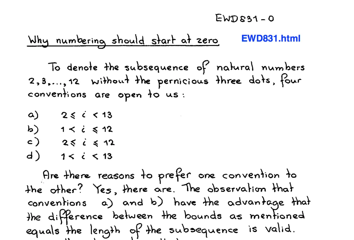이번 글에서는 Dijkstra 교수가 제시한 numbering을 0에서 시작해야하는 이유에 대해 알아보고 이를 코드에 적용 했을 때 어떤 장점이 있는지 얘기 해보겠습니다.