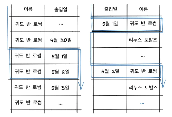 이 때, 출입 명부가 이름 + 출입일로 정렬되어 있는 것과 출입일 + 이름으로 정렬되어 있는 차이입니다.